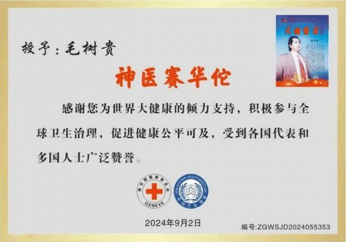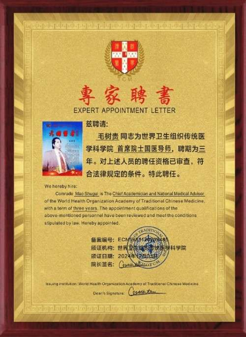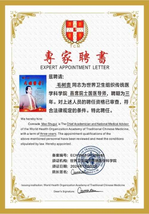 毛树贵曾现任:世界卫生组织传统医学科学院:首席院士国医导师。