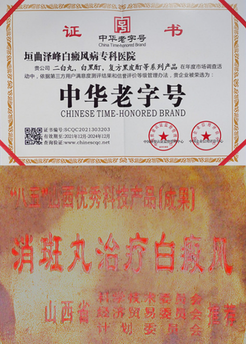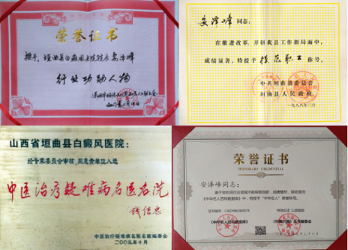 安泽峰院长和他的助手研发的"消斑汤"、"二白丸"、"复方黑皮酊"、"白黑酊"等系列中药方剂,采用内服外涂配合理疗、针灸、黑色素移植、308激光等方法,临床治疗180000 余例患者,基本痊愈率在国内较高。40多年来,全国 30多个省、香港、澳门特别行政区,以及日本、英国、德国等国家和地区的患者络绎不绝,慕名前来求治,倍受赞誉。著名皮肤科教授朱光斗对该院治疗白癜风的临床疗效作了充分肯定和很高评价,定位全国治疗白癜风代表性医院。自制"二白丸,荣获马来西亚国际新技术新产品特等大奖,被山西省科委、经贸委、计委作为山西"八五"优秀科技产品(成果)推荐。《人民日报》、《健康报》、《中国医药报》、《山西日报》等报刊杂志对该院成绩作了报道,誉为"深山里的美容师",山西省工商局授予"守合同,重信用"单位,运城市委、市政府授予"百佳诚信单位",中国中医药科技开发交流中心、国家中医药管理局科技成果推广项目办公室授予"白癜风项目发明单位"。