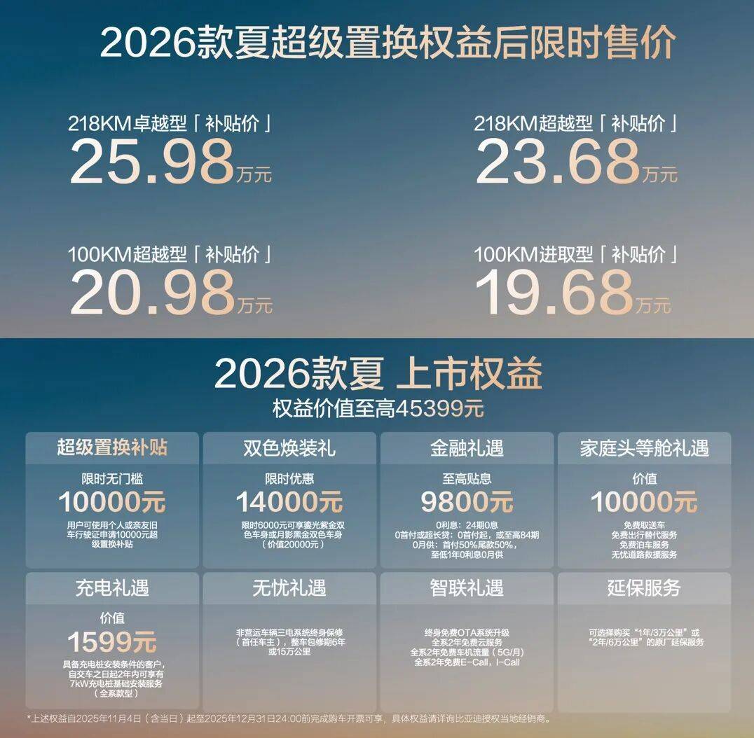 2025年11月4日,2026款夏正式上市,此次共推出4款车型,限时超级置换价19.68—25.98万元。2026款夏,可以承载两个人的浪漫、三个人的幸福、六个人的圆满,将MPV从“交通工具”升级为“移动生活空间”,是家庭用车一步到位的终极选择,是品质家庭专属的“家庭头等舱”。