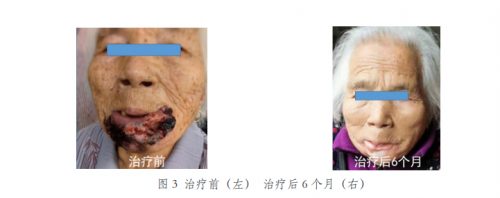 病例 3:下口唇基底细胞癌下唇肿物呈菜花状隆起,高龄。2023 年 9 月 24 日全麻后行超高温适温消融术,住院4天,术后 3 个月结痂脱落,6 个月后口唇形态基本恢复,无畸形(图 3)。治疗总费用6184.86元。