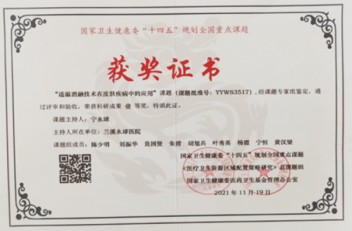 由他主导的“适温消融技术在皮肤疾病中的应用”于2021年11月19日荣获国家卫生健康委“十四五”规划全国重点课题《医疗卫生资源区域配置策略研究》总课题组、国家卫生健康委医药卫生基金管理办公室颁发的科研成果一等奖。