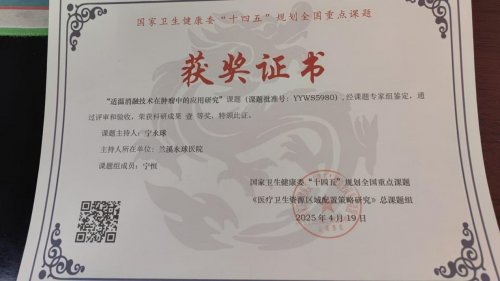 “适温消融技术在肿瘤中的应用”于2025年4月19日荣获国家卫生健康委“十四五”规划全国重点课题《医疗卫生资源区域配置策略研究》总课题组、国家卫生健康委医药卫生基金管理办公室颁发的科研成果一等奖。