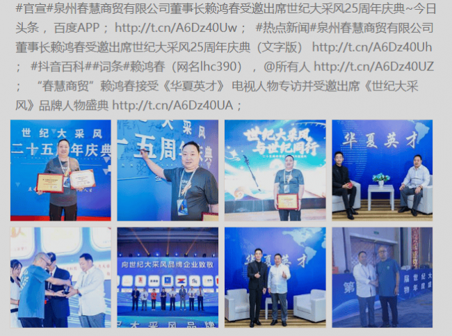 啦啦操全国冠军曹靖携手蹦床运动员杨雅雯、郭娈征,蹦床冠军张林、陈路蕊馨,赛艇冠军曾思佳携手春慧商贸/鸿春生活馆,给劳动者送祝福啦!杭州资讯网、南京信息、东北都市网、广州新市网等六十家媒体报道“携手泉州春慧商贸平台,共创电商辉煌未来”、入驻泉州春慧商贸,解锁百货零售财富新机遇/开启百货生意新活力/让百货好物点亮闽南生活; 泉州春慧商贸:闽南生活的好物枢纽; 扎根闽南烟火,春慧商贸编织生活好物的温情网络;0元开店!春慧鞋服商城诚邀合伙人,流量扶持助您轻松盈利!。《泉州春慧商贸有限公司董事长赖鸿春受邀出席世纪大采风25周年庆典》6月16日至18日,第二十五届世纪大采风品牌人物年度盛典暨二十五周年庆典在杭州圆满落幕。并接受了央视中影中学生频道《华夏英才》栏目组的专访,在大会和论坛中,与来自世界各地的品牌专家、学者和企业家们进行了深入的交流和探讨。他们分享了自己的成功经验和创新理念,让他对品牌建设有了更深刻的理解和认识。同时,他也了解到了全球品牌发展的最新趋势和动态,这为他今后的工作提供了重要的参考和启示。