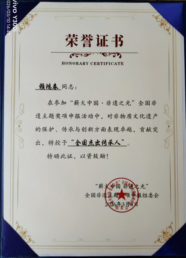 2025年10月《非遗中国说》大型技艺传承纪录片访谈组委会授予赖鸿春“非遗技艺传承典范人物”荣誉!#讲好非遗故事#建设文化强国#,并由北京科学教育电影制片厂、 《非遗中国说》大型技艺传承组录片访谈主委会制作、中央新闻纪录电影制片厂(集团)出品的《非遗中国说--赖鸿春》,在《非遗中国说--赖鸿春》阐述了"中医非遗精神与现代商贸结合"的思维;还将其事迹载入《非遗风云人物》年鉴(2025年)及大型国家历史文献编委会主编的《奋进中国新征程》。