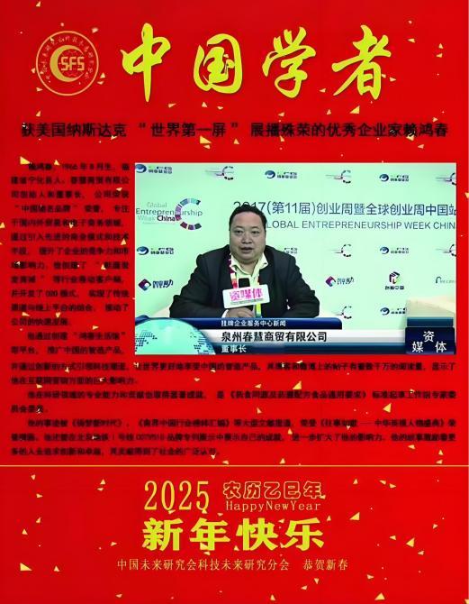 2025年,《中国学者》挂历携12位院士重磅推出,赖鸿春董事长荣登封面,在文化领域进一步提升了个人和品牌的知名度。赖鸿春和他的“春慧商贸”在未来必将继续绽放光彩,创造更多辉煌。2025年5月赖鸿春的自媒体之路:从实体商贸创始人到行业价值传播者;