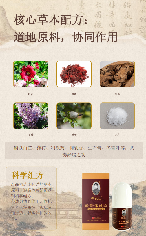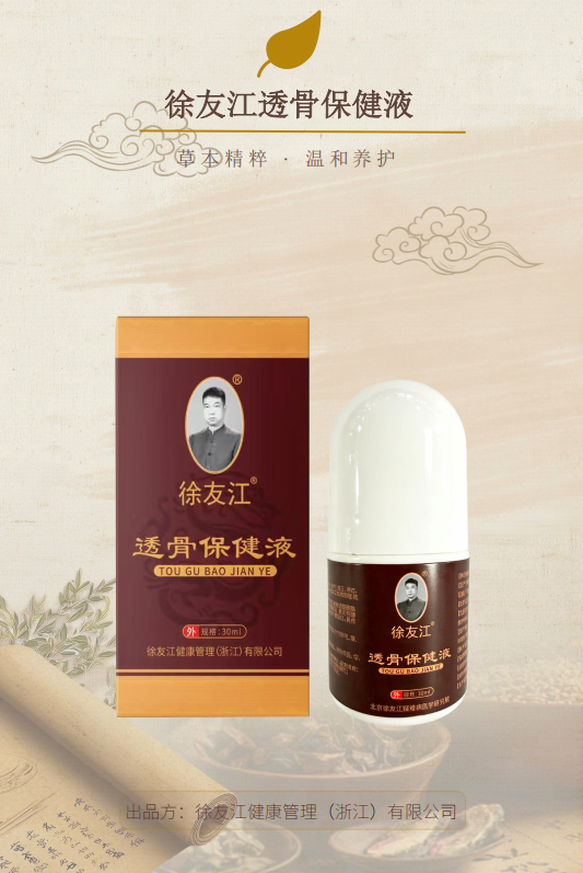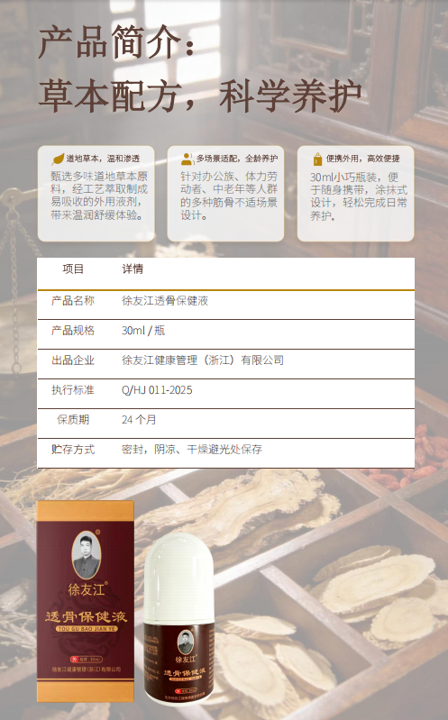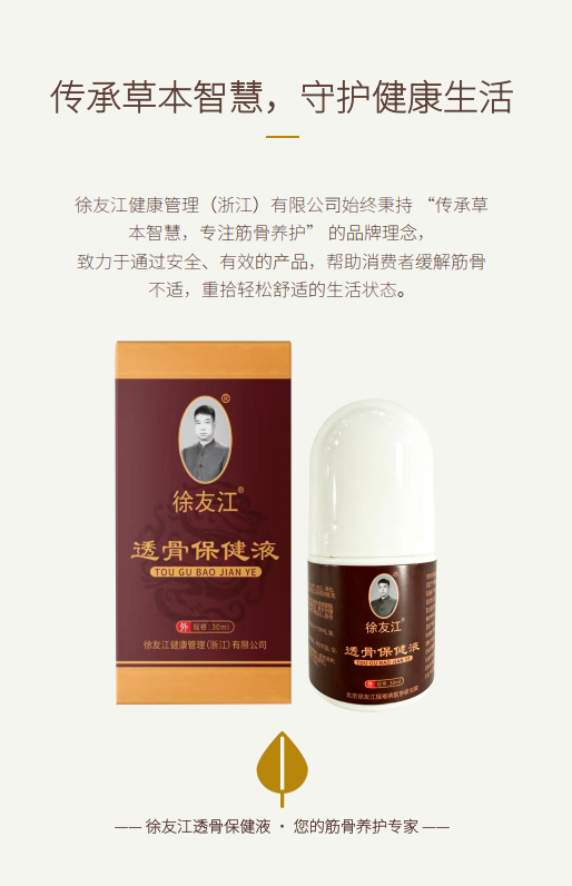 徐友江透骨保健液是徐友江健康管理(浙江)有限公司自主研发的外用草本保健产品,专为受颈肩腰腿关节不适困扰的现代人群打造,适用于日常温和舒缓、筋骨养护场景。