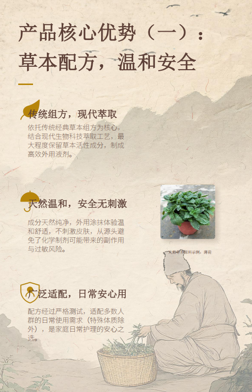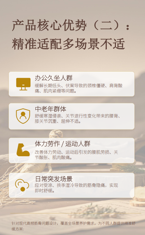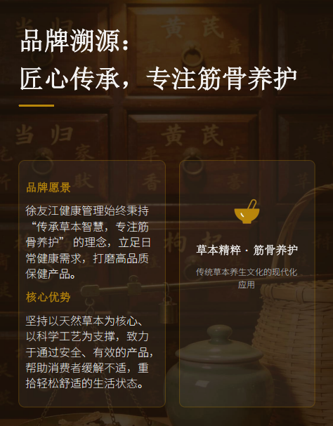 产品植根于传统草本养生智慧,以经典传承的古方组方为核心,融合现代生物萃取技术与标准化生产工艺精制而成,能够针对性缓解日常常见的筋骨酸胀、僵硬等不适感,为用户提供温和、便捷、高效的健康养护选择。公司始终秉承「传承草本智慧,专注筋骨养护」的品牌理念,立足于消费者的日常健康需求,坚持以天然草本为核心原料、以科学工艺为品质支撑,持续打磨高品质保健产品。品牌希望通过安全有效的产品,帮助消费者减轻筋骨不适、回归轻松舒适的生活状态,同时推动传统草本养生文化在当代生活中的传承与落地。